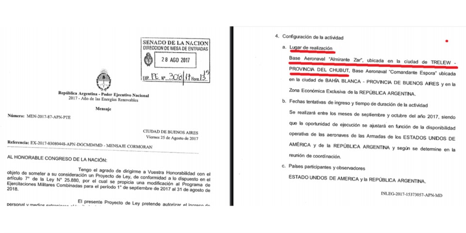 El programa se denominada “Cormorán” y contempla que las maniobras militares, así como el alojamiento de cientos de “marines” norteamericanos se dé en dos bases aeronavales del país: la “Almirante Zar” de Trelew y la “Comandante Espora” de Bahía Blanca, en la provincia de Buenos Aires.