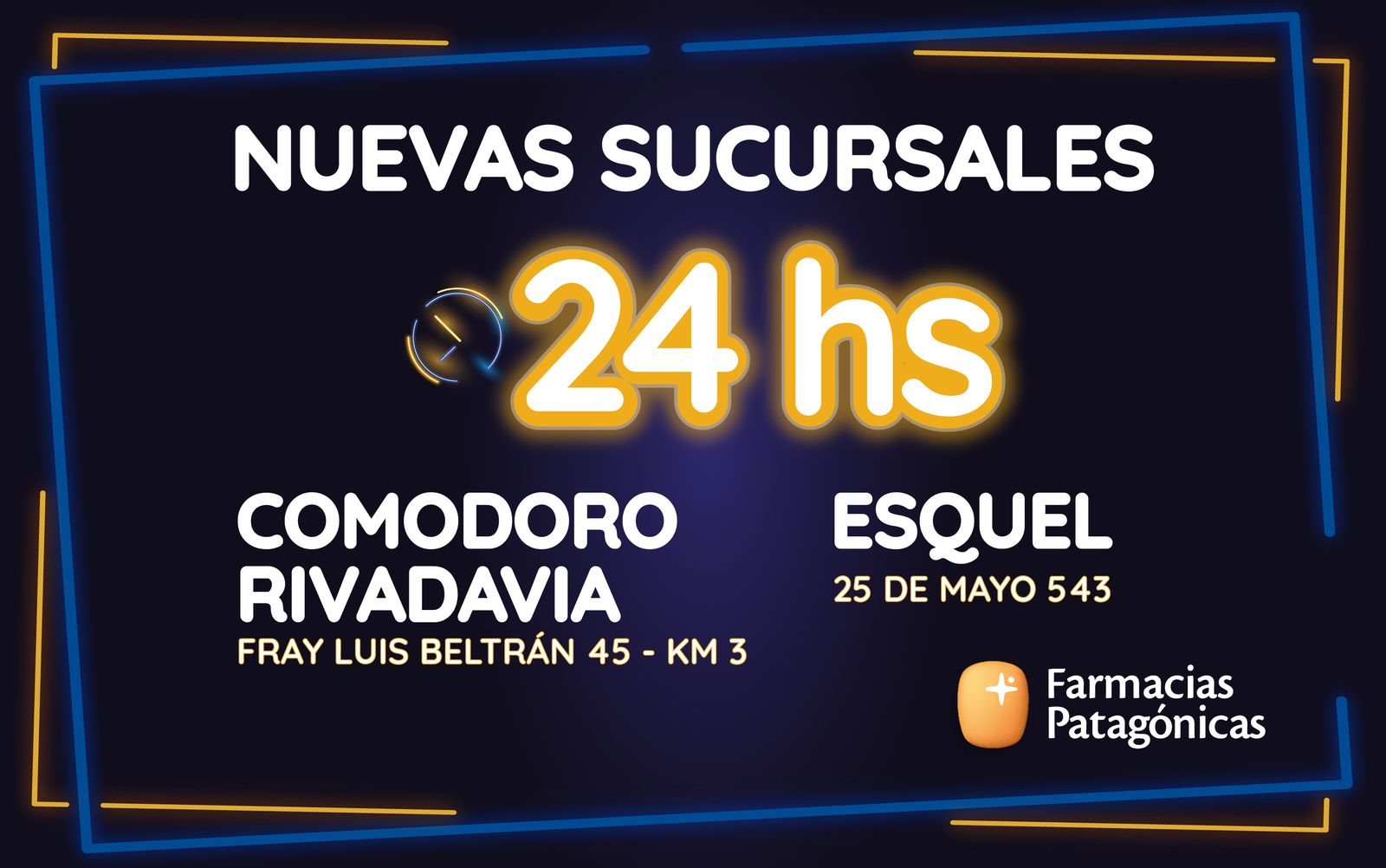 Farmacias Patagónicas, la cadena líder en Chubut, sigue marcando la diferencia al anunciar con orgullo que sus sucursales de Esquel y Mosconi en KM3, Comodoro Rivadavia, se suman a su servicio 24 horas, los 365 días del año. Esta expansión consolida a Farmacias Patagónicas como la única cadena farmacéutica con cobertura ininterrumpida en las 5 principales ciudades de Chubut.