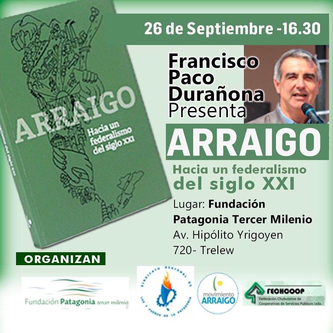 Francisco “Paco” Durañona, titular de Movimiento Arraigo, presentará el libro “Arraigo: hacia un federalismo del siglo XXI” el próximo viernes en Trelew. Será en la Fundación Patagonia Tercer Milenio, en la Avenida Hipólito Yrigoyen 720, desde las 16:30, con entrada libre y gratuita y organizado por Fundación Patagonia Tercer Milenio, el Sindicato Regional de Luz y Fuerza de la Patagonia y la Federación Chubutense de Cooperativas de Servicios Públicos junto a Movimiento Arraigo.