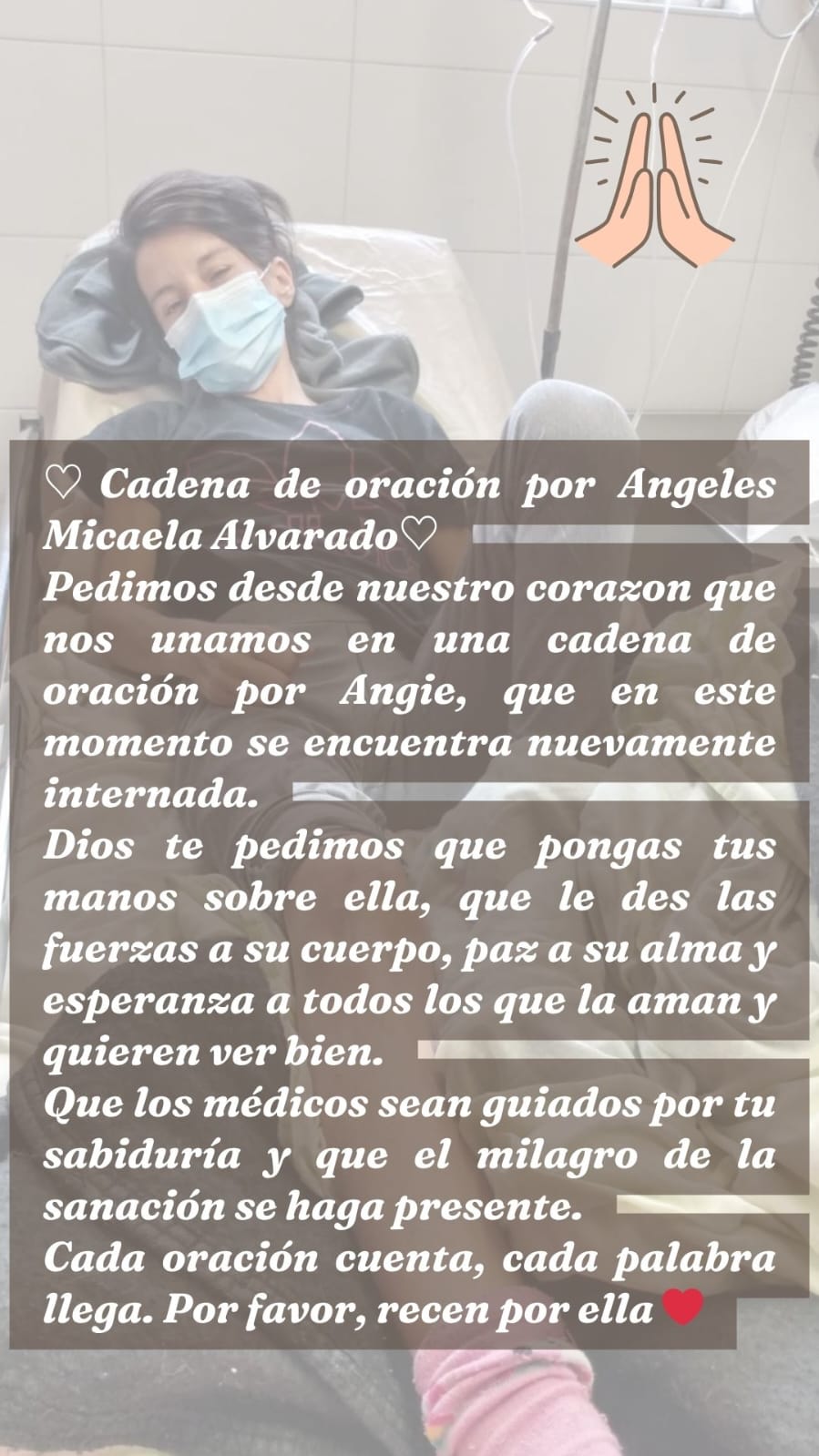 Lamentablemente, Angie Alvarado volvió a ser internada porque su cuadro de desnutrición se agravó.Así lo confirmó a Jornada Lorena Roht la profe de fútbol que permanece al cuidado de sus tres hijos. “Necesitamos comprarle insumos, como pañales que tienen un valor de $25.000, yo estoy desempleada y se nos complica”. Pese a eso, Lorena señaló que lo más importante es realizar una cadena de oración por la pronta recuperación de Angie.
