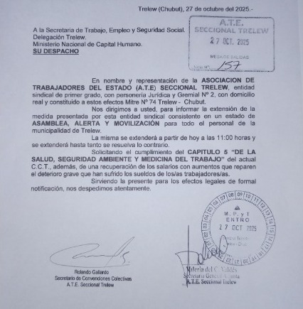El sindicato ATE (Asociación de Trabajadores del Estado) notificó este lunes al Ejecutivo municipal sobre la extensión de la medida de asamblea, alerta y movilización para todo el personal municipal de Trelew. Desde las 11 se manifestaron en la puerta del municipio sin cortar el tránsito. A las 13 comenzó una nueva reunión por paritarias.