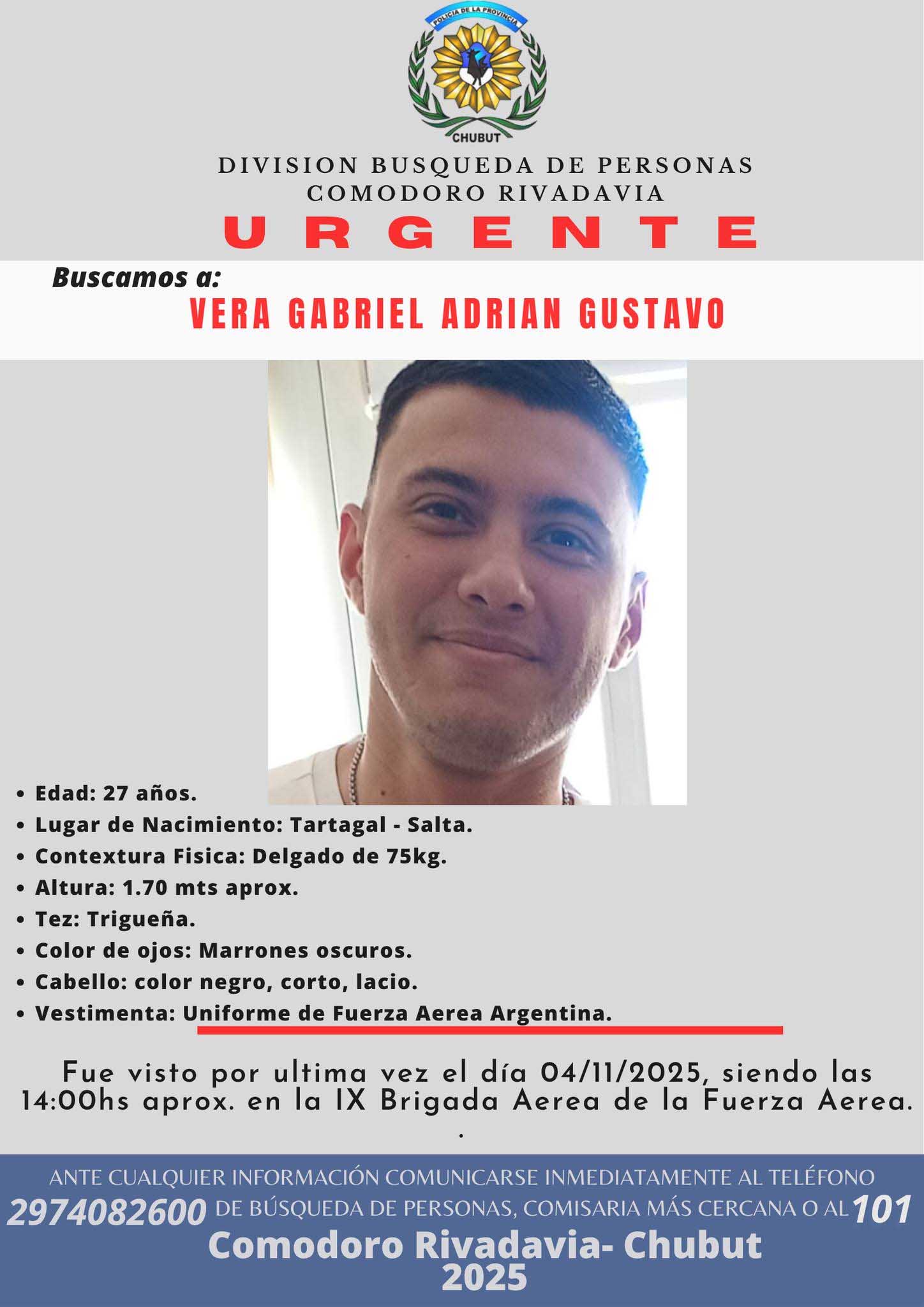 La policía del Chubut solicitó la colaboración de la comunidad para localizar a un hombre de 27 años identificado como Vera Gabriel Adrián Gustavo.