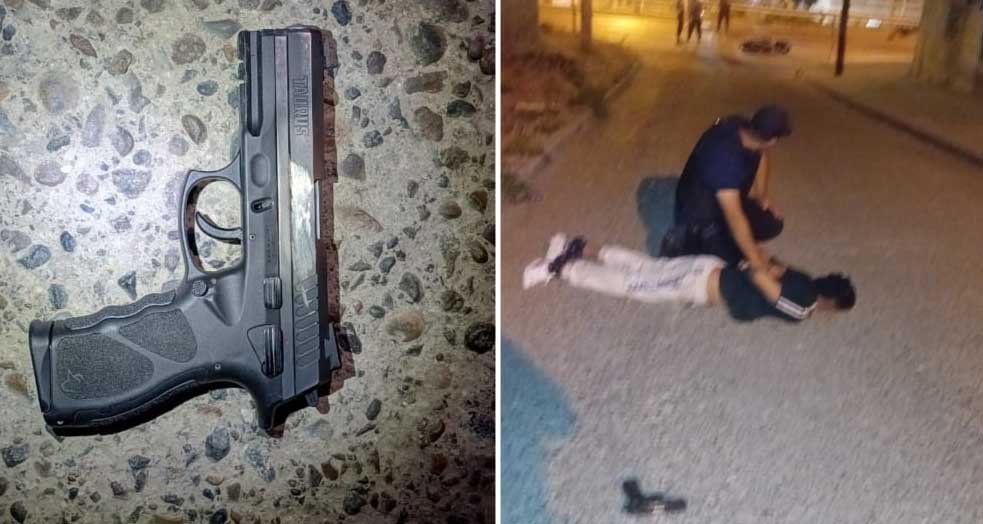 A los pocos metros es interceptado por personal policial y detenido. Durante el forcegeo, de entre sus ropas, cae un arma de fuego marca Taurus 9 mm.