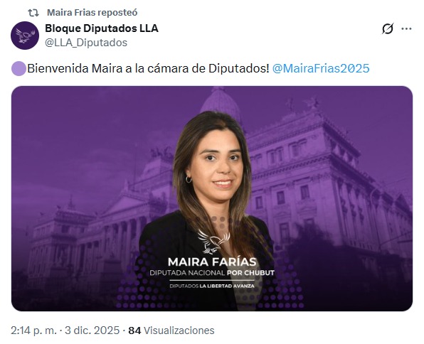 A modo de bienvenida, el bloque de diputados de LLA publicó en sus redes sociales una fotografía de cada uno de los legisladores que se suman a sus filas. En el caso de Chubut, pusieron la fotografía de Maira pero le cambiaron el apellido. Para ellos se trata de “Maira Farías”.