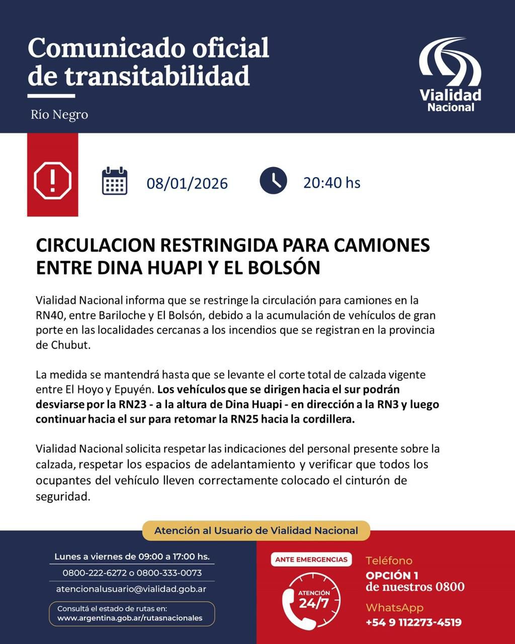 La Municipalidad de El Bolsón informó que se encuentra restringida la circulación de tránsito pesado en la Ruta Nacional 40, entre Bariloche y El Bolsón, por la acumulación de camiones en zonas cercanas a los incendios en Chubut.