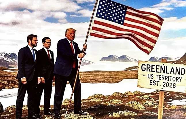 Según se ve en la imagen, Trump aparece acompañado por el vicepresidente estadounidense, JD Vance, y el secretario de Estado, Marco Rubio, con un cartel cerca que dice “Groenlandia-Territorio de los Estados Unidos Est. 2026”.