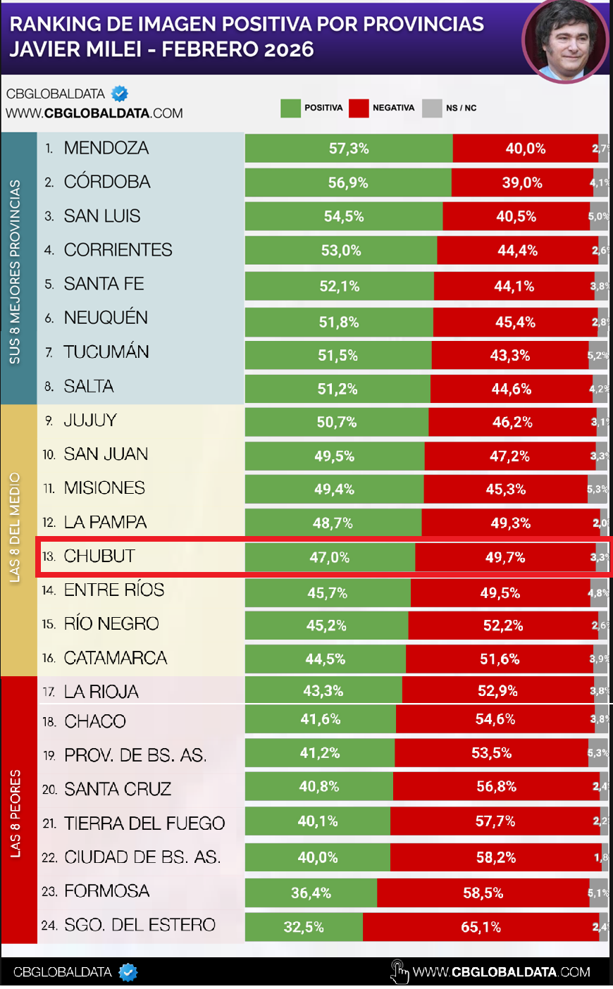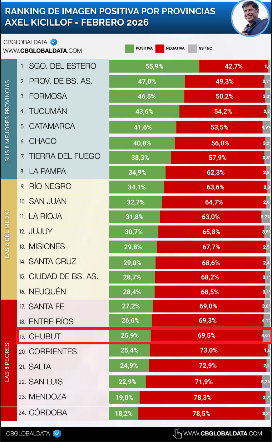 En ese escenario general, Chubut en particular también parece inclinarse por “las fuerzas del cielo”. La diferencia, según CB Global Data, es contundente: registra un 47% de imagen positiva, frente a un 25,9% de Axel Kicillof, lo que marca una brecha de más de 21 puntos porcentuales a favor del Presidente.