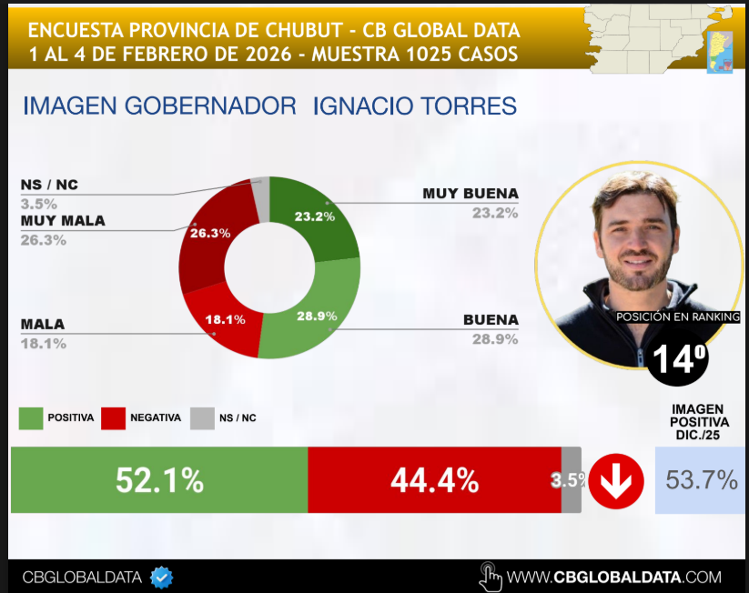 El ranking de imagen positiva de gobernadores correspondiente a febrero de 2026 muestra un escenario relativamente equilibrado, con una mayoría de mandatarios provinciales concentrados en una franja media de aprobación que va del 50 al 55 por ciento. En ese contexto, Nacho Torres, gobernador de Chubut, se ubica en el puesto 14° a nivel nacional, con una imagen positiva del 52,1%, lo que lo mantiene dentro del grupo de gobernadores con balance favorable entre aprobación y rechazo.