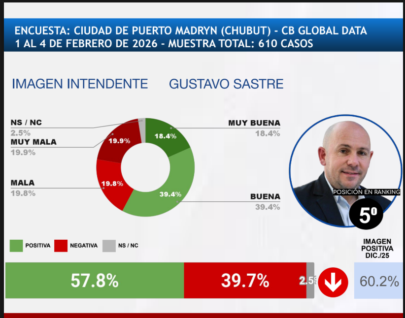 Mientras que en el Ranking de Intendentes, el madrynense Gustavo Sastre mantiene un nivel alto de aprobación entre los vecinos de la ciudad, de acuerdo con la encuesta realizada por CB Global Data.