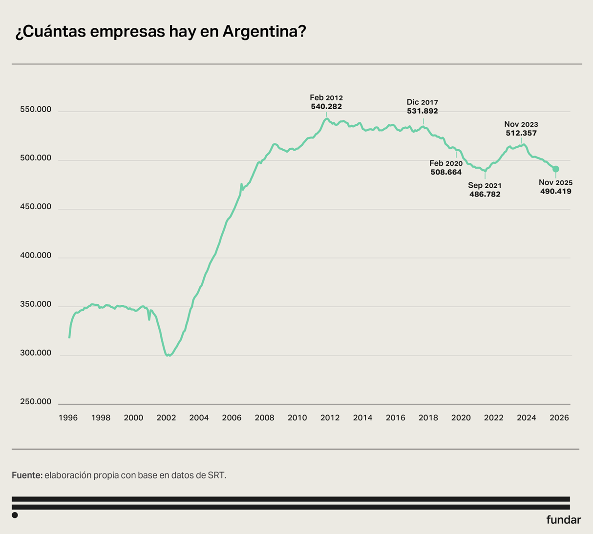 Las cifras son durísimas e incontrastables: el tejido productivo argentino se está encogiendo a un ritmo comparable con el de la pandemia. Según datos de la Superintendencia de Riesgos del Trabajo, consolidados por el Monitor Mensual de Empresas que realiza el centro de innovación en políticas de desarrollo Fundar, en noviembre de 2025 se contabilizaron 892 empresas menos que el mes anterior. No se trata de un episodio aislado sino de la décimo cuarta caída mensual consecutiva.