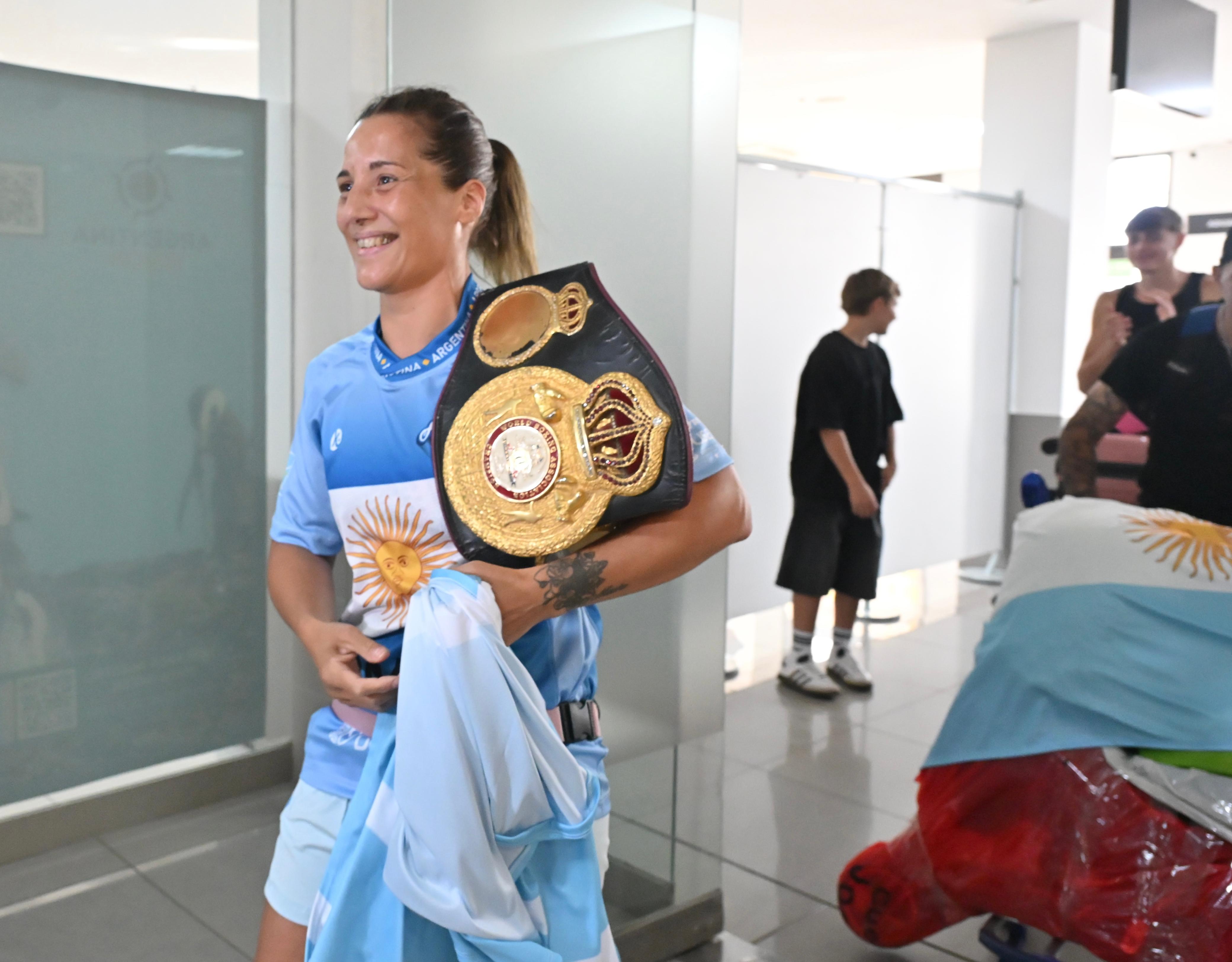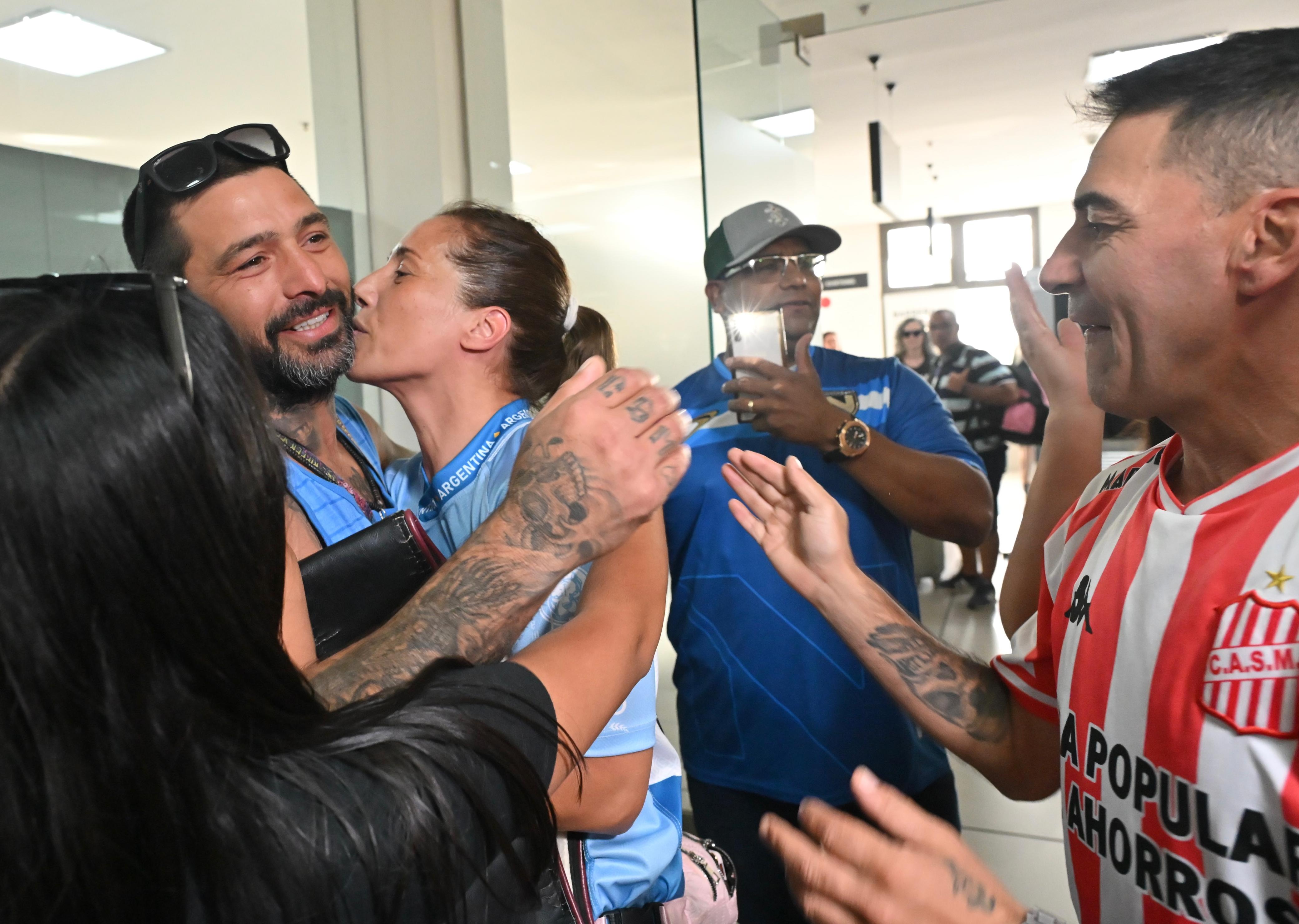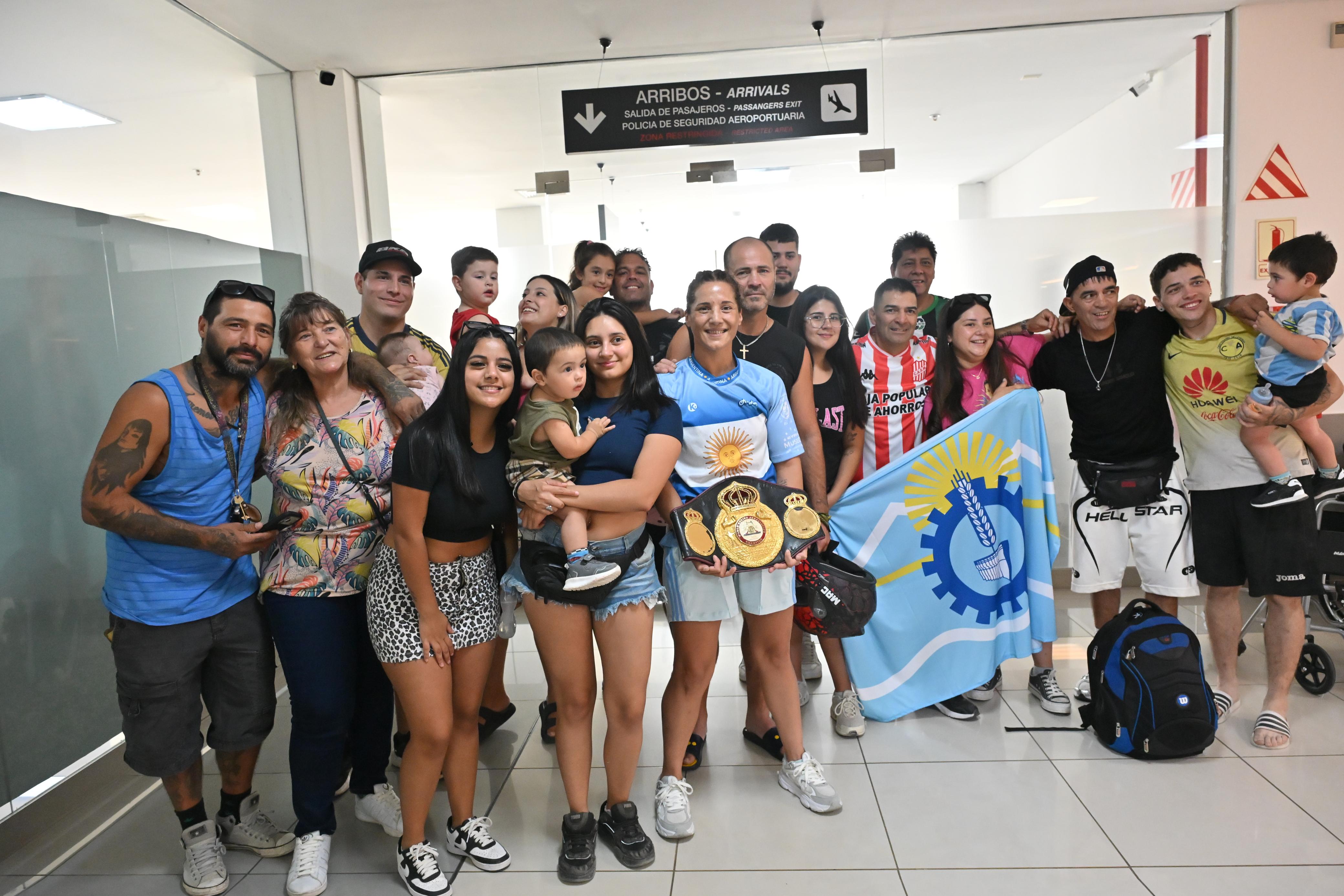 La escena familiar es íntima y multitudinaria al mismo tiempo en el Aeropuerto. Fue recibida en Trelew por sus afectos. Entre ellos, estaba su hermano Lucas Matthysse, otro que sabe lo que es ser campeón del mundo.