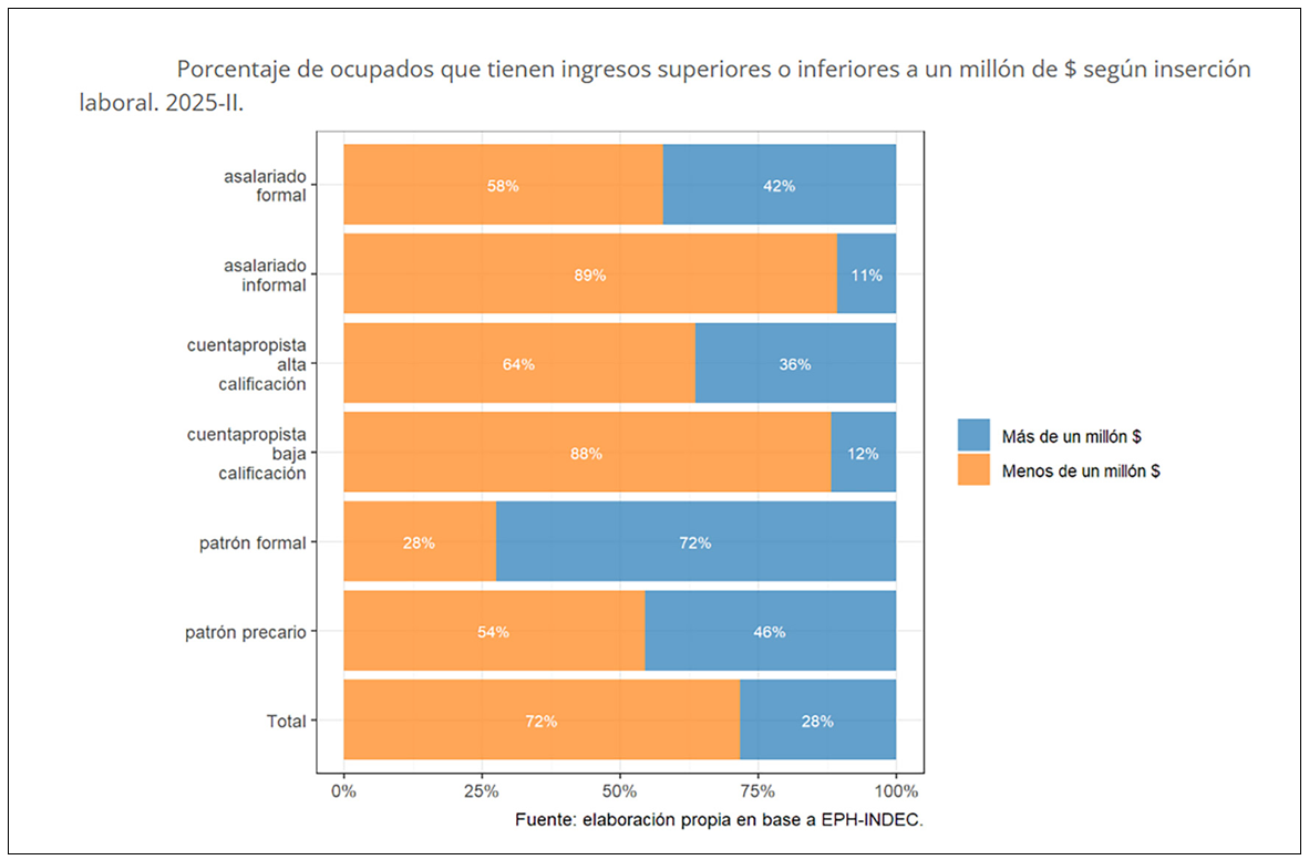 Según este Instituto de la UBA, un 72% del conjunto de los trabajadores (incluyendo formales e informales) recibía a finales de 2025 un sueldo mensual inferior a $ 1 millón. Este umbral es crítico, ya que la Canasta Básica Total (CBT) para un hogar tipo ascendía a $ 1.213.799 en octubre del año pasado. ¿Todo marcha de acuerdo al plan (TMAP), como le gusta decir a Milei?