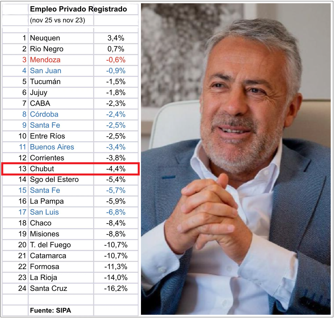 En ese contexto, el dato de Chubut resulta especialmente preocupante. Según el mismo informe del SIPA, la provincia registra una caída del 4,4% en el empleo privado formal entre noviembre de 2023 y el mismo mes de 2025, ubicándose en el puesto 13 entre las 24 jurisdicciones del país.