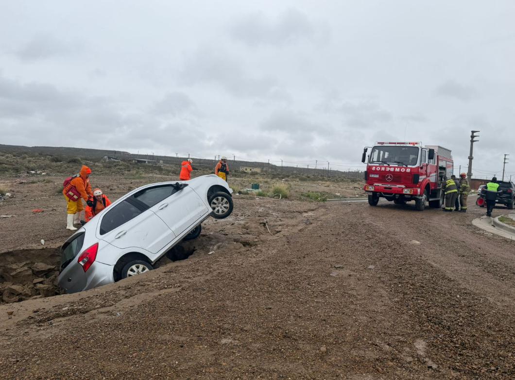 Un vehículo Ford finalizó, en la tarde de este domingo, en una zanja en la zona norte de Puerto Madryn, luego que su conductor perdiera el control del mismo en un camino de ripio que se encontraba dificultoso a raíz de la lluvia y el barrio.