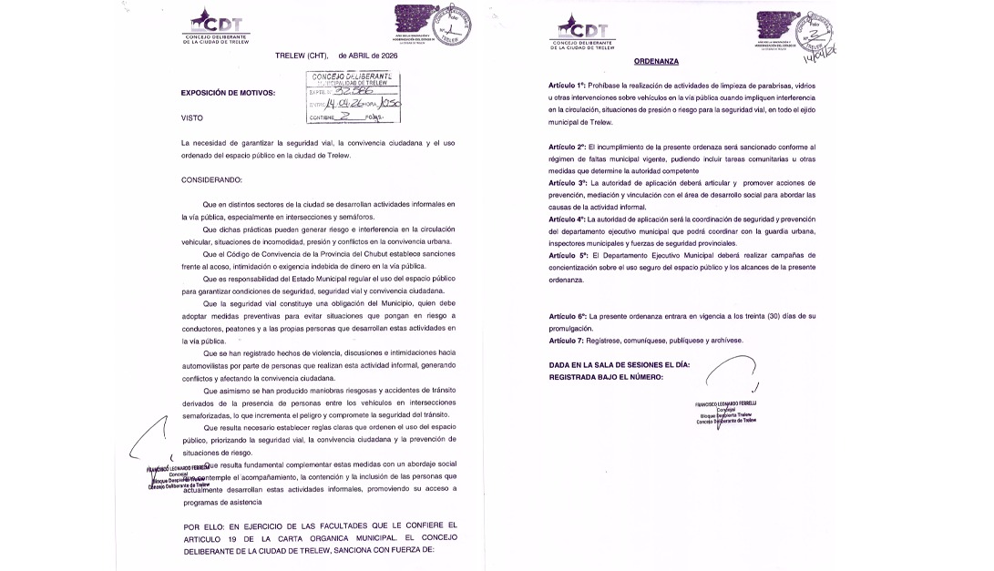 Con el fin de ordenar el tránsito y brindar mayor seguridad a los conductores, el concejal Leonardo Ferrelli del Bloque Despierta Trelew remontó una iniciativa ya plasmada en 2019. Presentó un proyecto de ordenanza para quitar a los “trapitos” de las esquinas. “Es un proyecto que prohíbe los limpiavidrios en las intersecciones”. Se busca articular el trabajo con Desarrollo Humano en el caso de ser necesario.