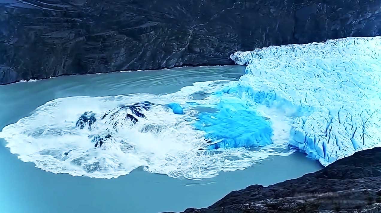 En el video se ve el momento exacto en que la colosal masa de hielo se quiebra, gira y cae generando olas enormes.#