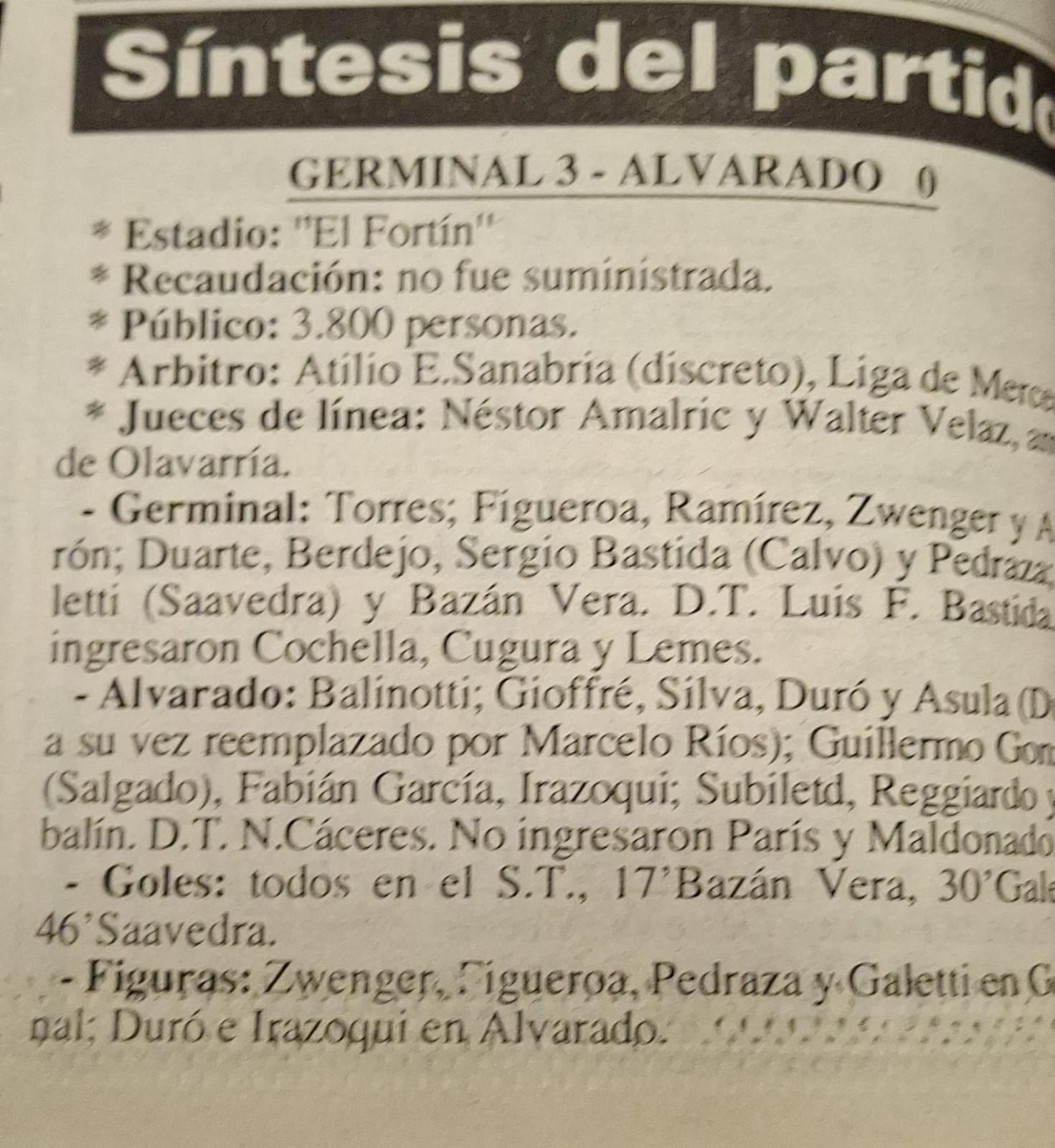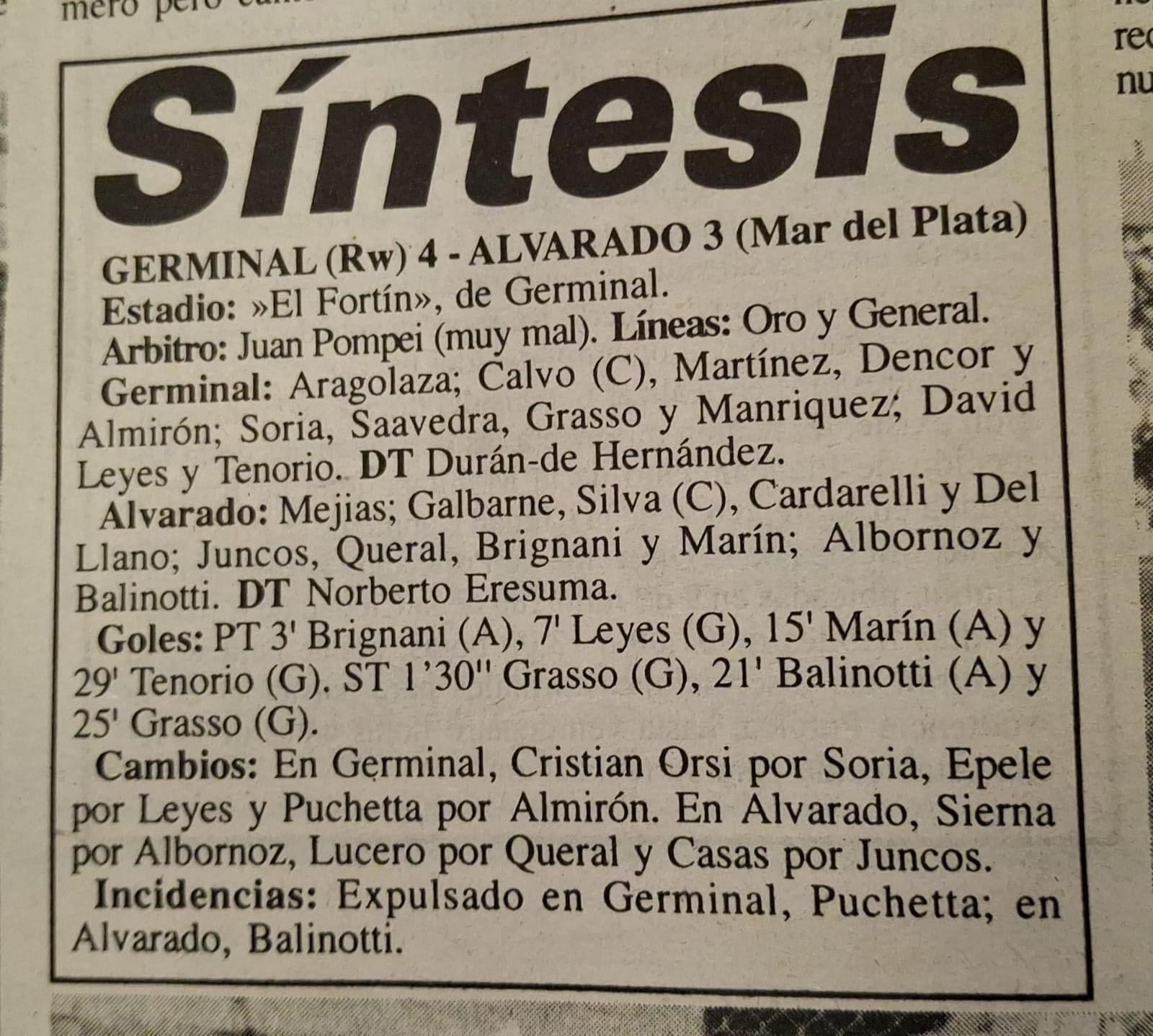 Germinal de Rawson vuelve a jugar con Alvarado de Mar de Plata 29 años después. El historial marca ventaja para el "Verde" con dos victorias, ambas en Rawson, una derrota y un empate.