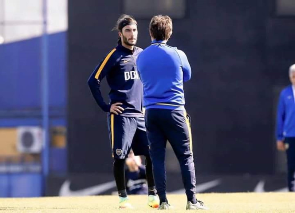 El volante colombiano, con su clásica vincha azul y ropa del mismo color, participó del ensayo de fútbol que dispuso en entrenador Guillermo Barros Schelotto en la cancha número uno del complejo Pedro Pompilio, aledaño a la Bombonera.