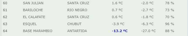 Según el Servicio Meteorológico Nacional, el top five de registros más fríos se completa con El Calafate en Santa Cruz, Bariloche en Río Negro y San Julián, también en Santa Cruz.