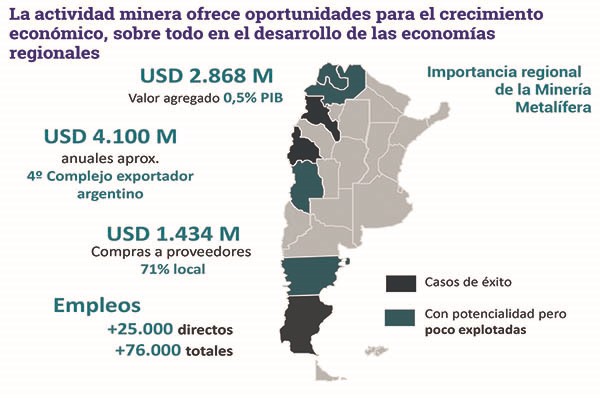 Así, con U$S 4.100 millones, la minería forma el 4º complejo exportador de Argentina, otorgando un valor agregado de U$S 2.868 millones (0,5% del PBI). Primero figura el complejo oleaginoso, lo siguen los cereales, el sector automotriz y luego aparece la minería.