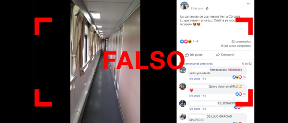 Una foto que muestra lo que parece ser el vagón de un tren moderno y en buen estado circula en las redessociales desde el 22 de junio último,en posteos que aseguran que se trata de los ferrocarriles que viajan de Buenos Aires a Córdoba, en la Argentina, y que fueron “recuperados” por el presidente Mauricio Macri.La foto,compartida más de 16.000 veces, según los datos de la propia publicación, es real: muestra el ingreso a los camarotes de los trenes que unen la capital argentina con Córdoba,en el centro del país.Sin embargo, estas nuevas unidades fueron puestas en funcionamiento durante el gobierno de Cristina Fernández de Kirchner, anterior al de Macri.