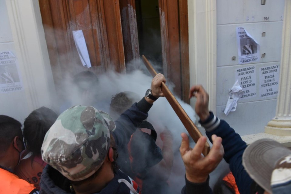 Los trabajadores pidieron acelerar el encuentro con los funcionarios. La tensión llegó a su punto máximo cuando el secretario general del Sindicato de la Salud Pública (SiSaP) de Chubut, Carlos Sepúlveda, sufrió una lesión en uno de sus pies tras un altercado con la Policía en una de las puerta del edificio ubicado sobre la Peatonal Fontana. Ante esta situación, algunos manifestantes rompieron parte de la puerta de madera y desde el interior del recinto las fuerzas de seguridad arrojaron gases lacrimógenos.