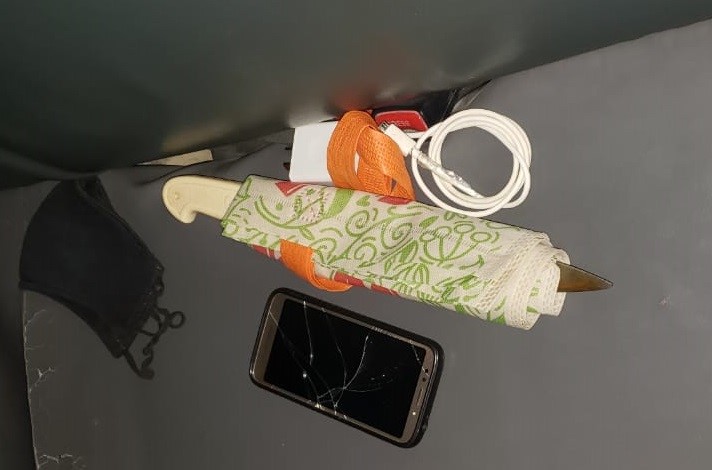 El pasajero, de 41 años de edad, fue palpado por los oficiales por la búsqueda del arma. Posteriormente observaron que en la butaca trasera del rodado se encontraba el arma blanca envuelta en una bolsa de tela ecológica.