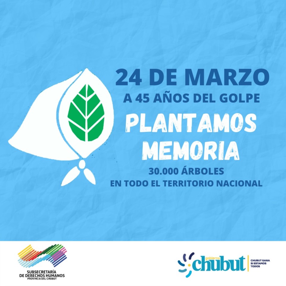 En el marco del 45° Aniversario de la última dictadura cívico-militar, el Ministerio de Gobierno y Justicia del Chubut, a través de la Subsecretaría de Derechos Humanos, adhiere a la Campaña “Plantamos Memoria”, convocada por los organismos de Derechos Humanos para conmemorar el “Día Nacional de la Memoria, por la Verdad y la Justicia”. La invitación fue realizada por la presidenta de Abuelas de Plaza de Mayo, Estela de Carlotto, para el próximo #24M.