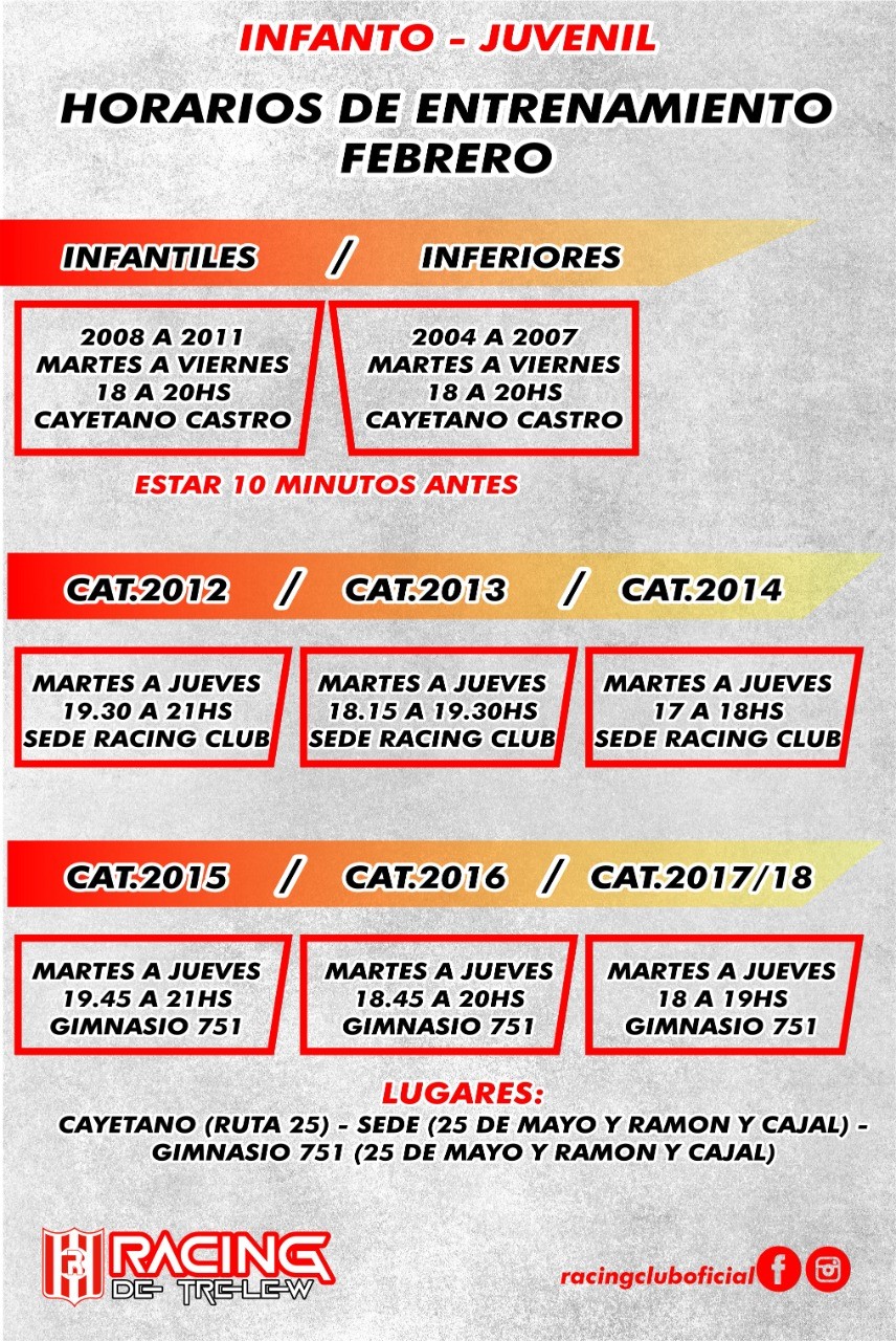 Uno de los más prolíficos semilleros de la región vuelve al ruedo.El próximo martes comenzará la actividad de las divisiones formativas de Racing Club de Trelew. Jornada adjunta el calendario completo de actividades.