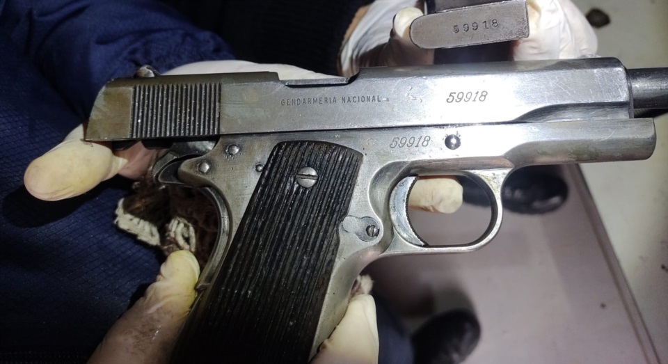 Entre las ropas de los dos aprehendidos, quienes ingresaron a la Comisaría por el delito de “abuso de arma”, encontraron un arma de fuego tipo 11/25 con inscripción "Gendarmería Nacional" y municiones de 11/25 y 0.38 mm, sumando un total de 24 cartuchos a bala.