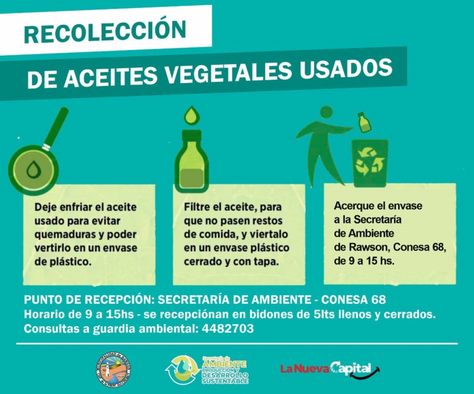 La Municipalidad de Rawson, a través del área de Ambiente, comenzó a implementar el convenio firmado por el intendente Damián Biss y ratificado por el Concejo Deliberante para la recolección de los aceites vegetales usados (AVUS), tanto los provenientes del uso domiciliario como los de los restaurantes, rotiserías y otros grandes generadores, con el objetivo de evitar daños ambientales.