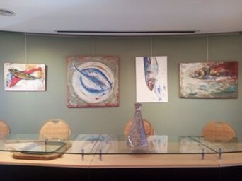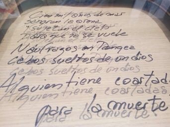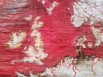 La propuesta se enlaza claramente con antiguos planisferios escolares de telas intervenidos con colores saturados en donde el rojo sangre predomina cómo crítica ecologista a lo que por estos días sufren nuestros océanos.Un par de objetos poéticos rescatados de algún barco completan la propuesta.