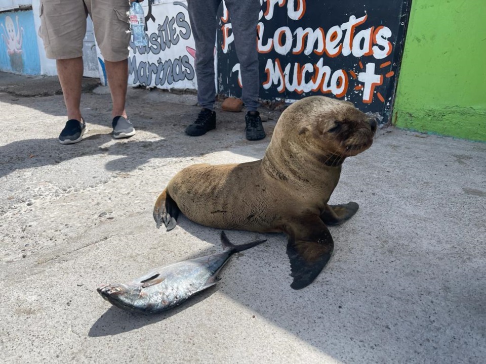 “Frijolita” es el cachorro de lobo marino que perdió a su madre y desde hace unos días se acerca a los vendedores de pescado de Puerto Rawson en busca de alimento.