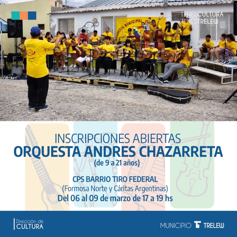 La Orquesta Infanto-Juvenil de Instrumentos Latinoamericanos de la Municipalidad de Trelew, Andrés Chazarreta, abre las inscripciones para el 2023. Será entre el lunes 6 y el jueves 9 de marzo, en el horario de 17 y las 19 horas, en el Centro de Promoción Social del Barrio Tiro Federal, sito en Formosa Norte y Cáritas Argentina.