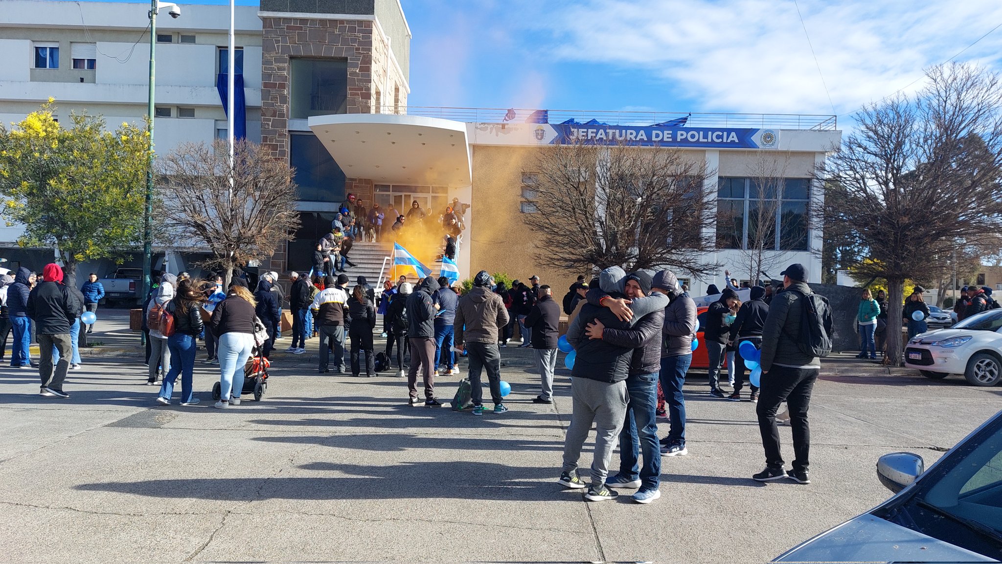 Este miércoles por la mañana personal activo y pasivo de la Policía de Chubut se manifestó frente a la Jefatura de Policía de Rawson a la espera de una reunión con el ministro de Seguridad, Miguel Castro.