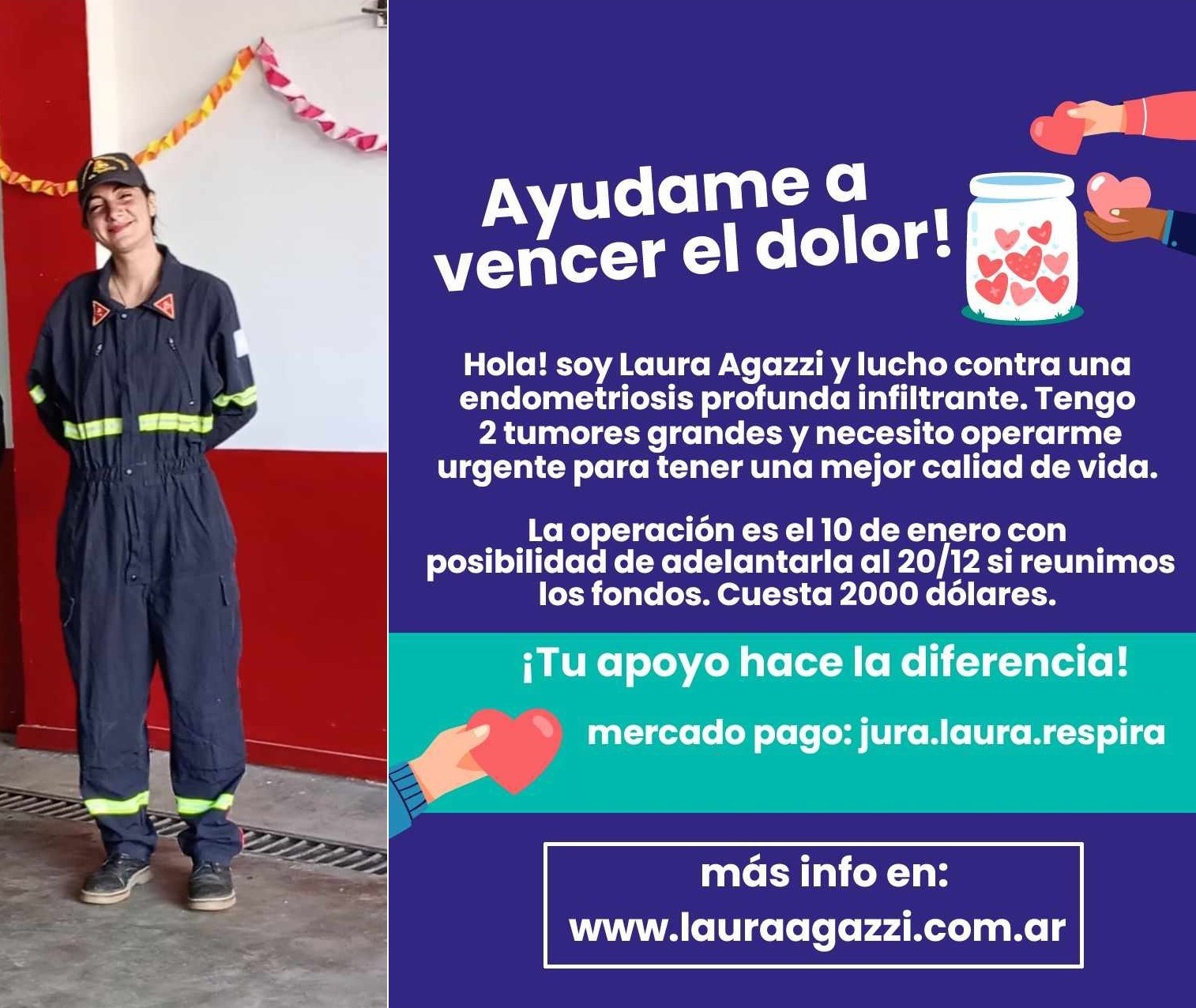 Si logran recaudar el monto necesario, Laura podría ser intervenida en nueve días, es decir, el 20 de diciembre. Por este motivo, su familia rápidamente convocó a los vecinos de su localidad y de ciudades vecinas a través de su página web www.lauraagazzi.com.ar para que puedan colaborar con ellos. Hasta el momento llevan alrededor de 700 mil pesos recaudados, pero aún les falta más de un millón.