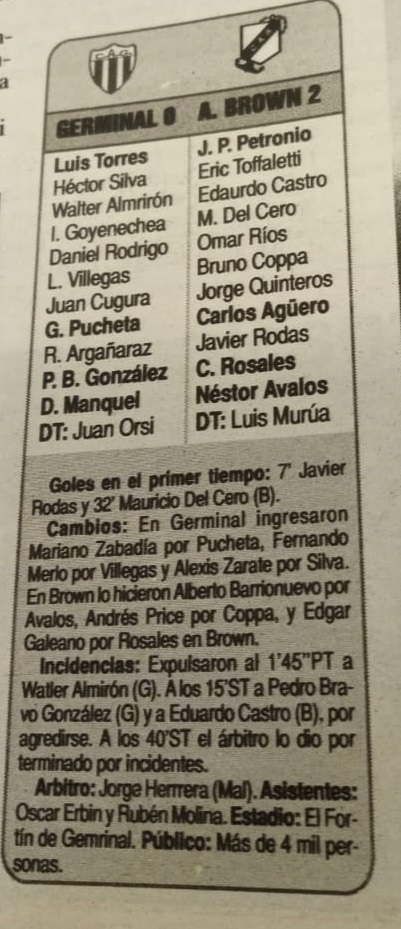 El Consejo Federal dio por finalizado el encuentro y Guillermo Brown continuó con un imparable camino hacia el ascenso al Federal A. Germinal, en tanto, empezó a recorrer la ruta inversa que empezó a enderezarse a finales de dicha década.