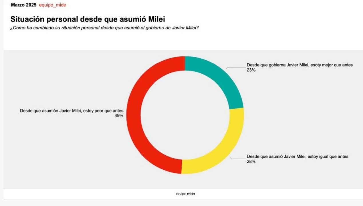 Asimismo, se les preguntó por su situación personal, desde la asunción del nuevo Gobierno Nacional, y el 49% confesó estar “peor que antes” y el 28% consideró “estar igual”; con respecto a las medidas económicas tomadas por Milei el 40% está “muy en desacuerdo” y el 11% “parcialmente en desacuerdo”.