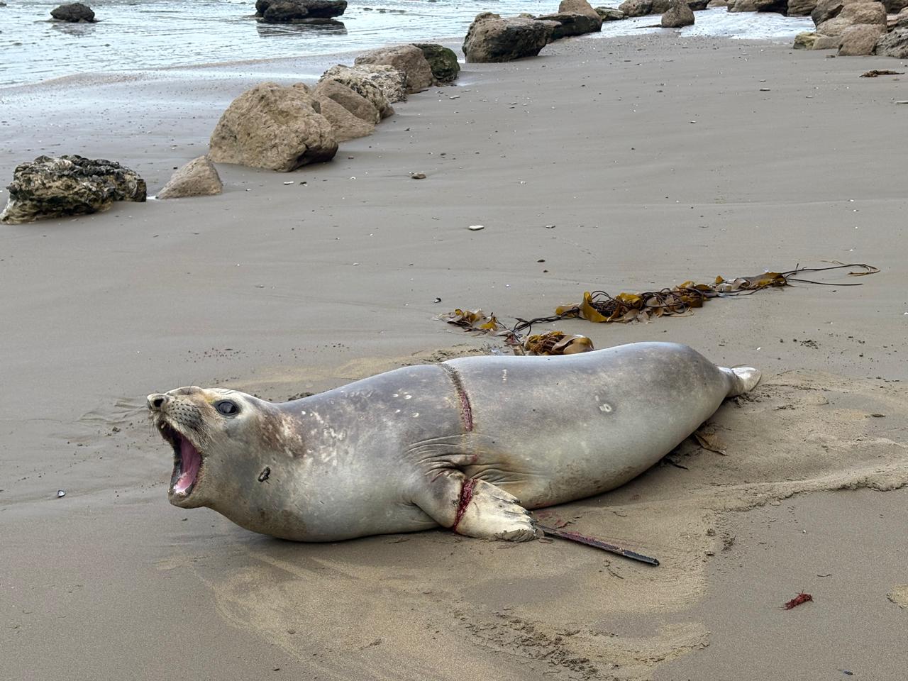 Una intervención precisa y oportuna permitió salvar la vida de un joven elefante marino que había quedado severamente enmallado con una correa de motor en Pico Sayago, al sur de Península Valdés. El elemento, que rodeaba su cuerpo y comprometía una de sus aletas pectorales, había generado una lesión visible por la presión sostenida durante un tiempo prolongado.