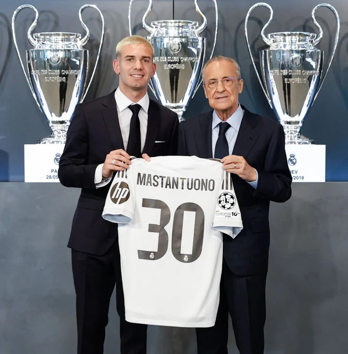 El club “Merengue”, por su parte, le dio la bienvenida con una publicación en las redes sociales que iba acompañada de una foto del presidente del club,Florentino Pérez, posando con Mastantuono y la camiseta número30que usará durante la próxima temporada.