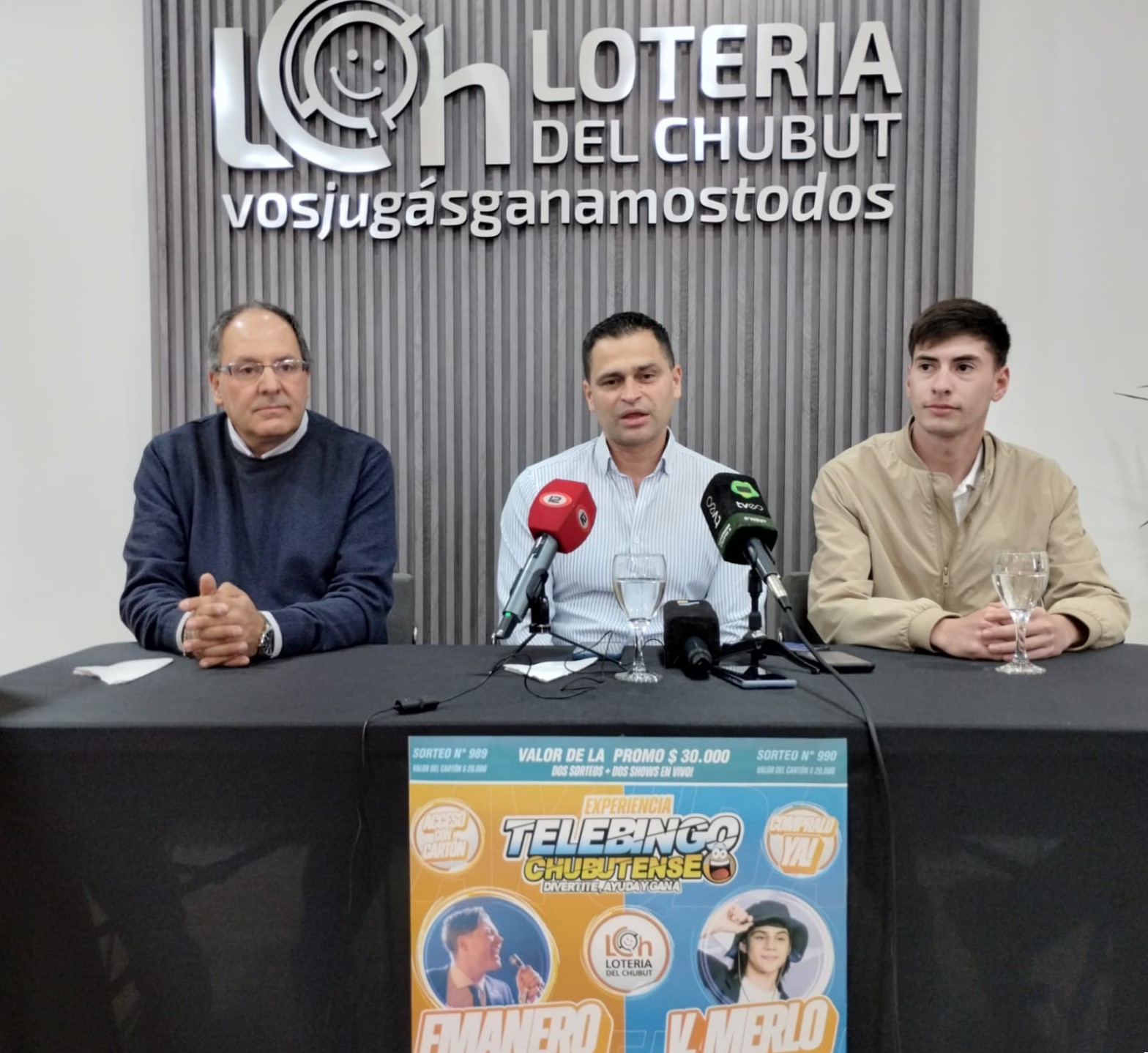 En la presentación del evento, que marcará la vuelta de un sorteo a la localidad luego de 10 una década, estuvieron el presidente del Instituto de Asistencia Social (IAS) y Lotería del Chubut, Ramiro Ibarra; el gerente general del organismo, Daniel Cambón Rubí y el intendente de 28 de Julio, Luka Jones.