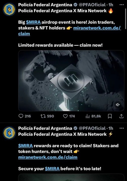 Las publicaciones mencionan: “Policía Federal Argentina ? Mira Network, Big $MIRA airdrop event is here! Join traders, stakers & NFT holders. Limited rewards available — claim now!”
