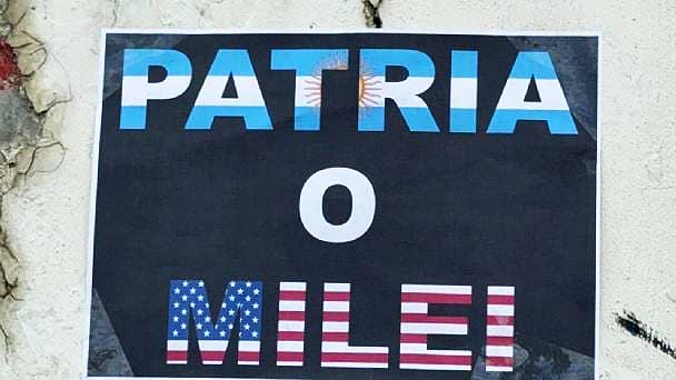 “Patria o Milei”, se lee en algunas de las pegatinas que están en las paredes y, paralelamente, un grupo de ciudadanos anunciaron un encuentro, hoy a las 16 en la Plaza Cívica “en defensa de la industria, los jubilados, los trabajadores, los estudiantes y las personas con discapacidad”.