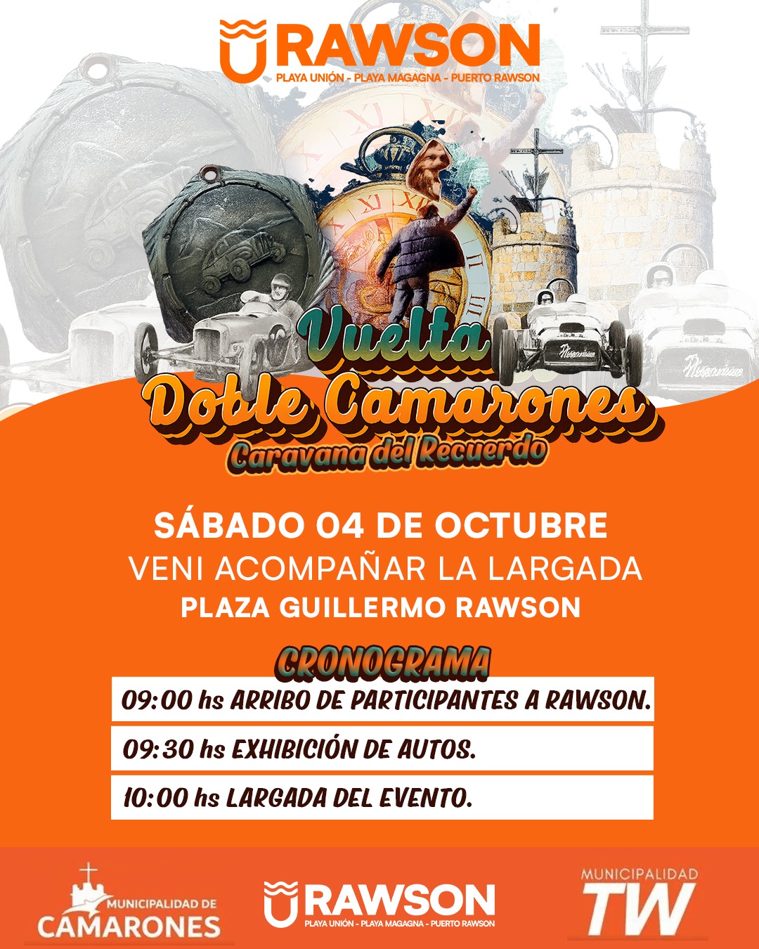 La segunda edición de la “Vuelta Doble Camarones – Caravana del Recuerdo” contará con más de 160 participantes entre autos y motos, recorrerá la Ruta Provincial N°1 “Ruta Azul” y tendrá su epicentro en Rawson, culminando en Camarones. Se prevén cortes de tránsito en rutas y calles principales para garantizar la seguridad de corredores y público.