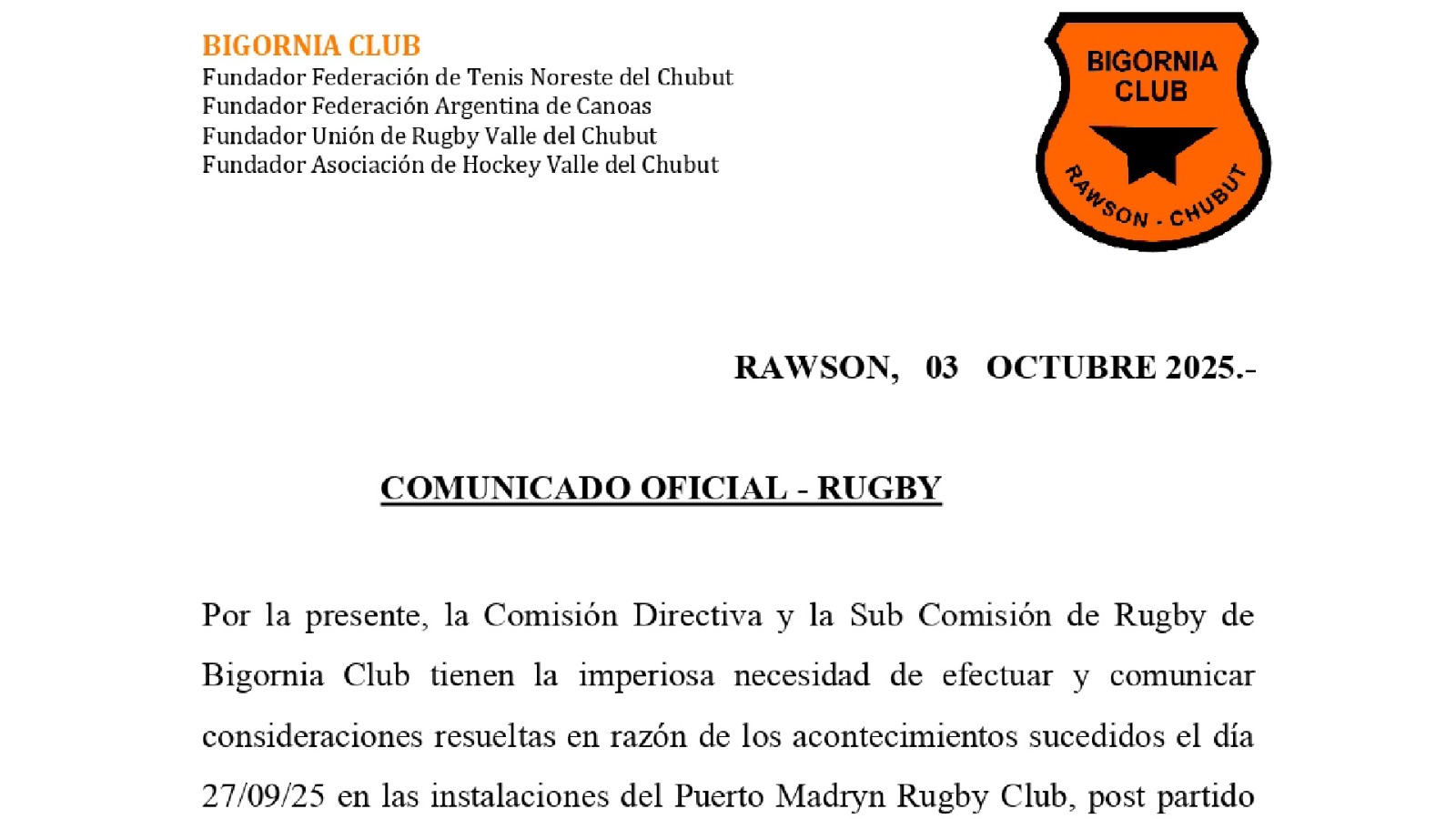 De acuerdo al pronunciamiento, la cúpula de Bigornia “tiene la imperiosa necesidad de efectuar y comunicar consideraciones resueltas en razón de los acontecimientos sucedidos el día 27/09/25 en las instalaciones del Puerto Madryn Rugby Club, post partido de la división M-18, fuera del campo de juego y que involucró a jugadoresde ambos equipos”.