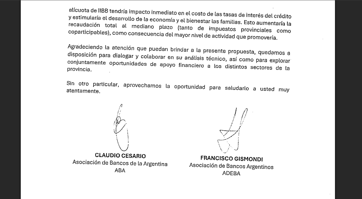 “Tenemos el agrado de dirigirnos a Usted para remitirle la nota suscripta por la Asociación de Bancos Argentinos (ADEBA) y la Asociación de Bancos de la Argentina (ABA), vinculada con el impacto que el impuesto sobre los ingresos Brutos (IIBB) genera sobre la operatoria del crédito bancario y, en consecuencia, sobre el desarrollo productivo de la provincia, así como sobre las posibilidades de acceso al financiamiento por parte de familias y empresas”, señalan los bancos en su escrito a los diputados de Chubut.