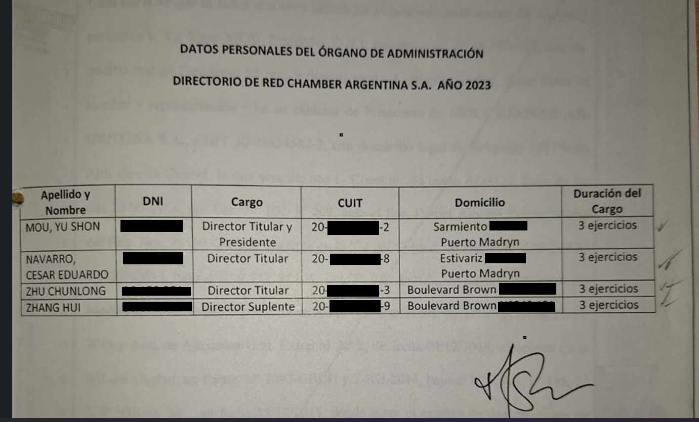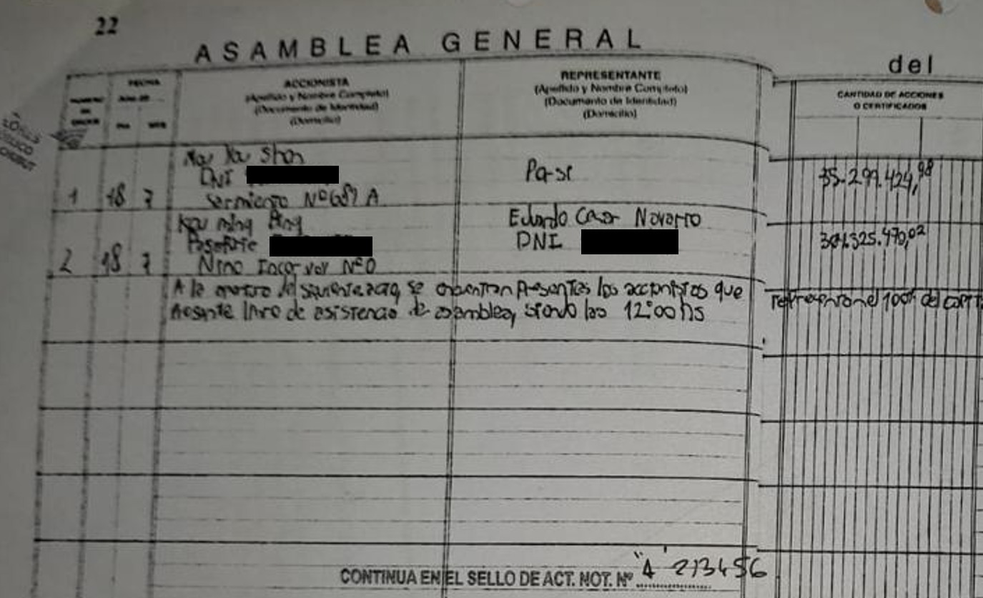 La documentación a la que accedió Jornada es contundente sobre quiénes son los accionistas de Red Chamber Argentina SA en todos estos años: Yu Shon Mou (alias “Marcelo Mou”) y Ming Bin Kou, otro empresario de origen chino que figura como CEO de la Red Chamber Co. pero en Red Chamber Argentina figura a título personal.