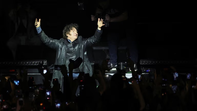El presidente Javier Milei inició su acto musical en el Movistar Arena, con motivo de la presentación de su nuevo libro “La construcción del milagro”, al ritmo de “Demoliendo Hoteles” de Charly García.