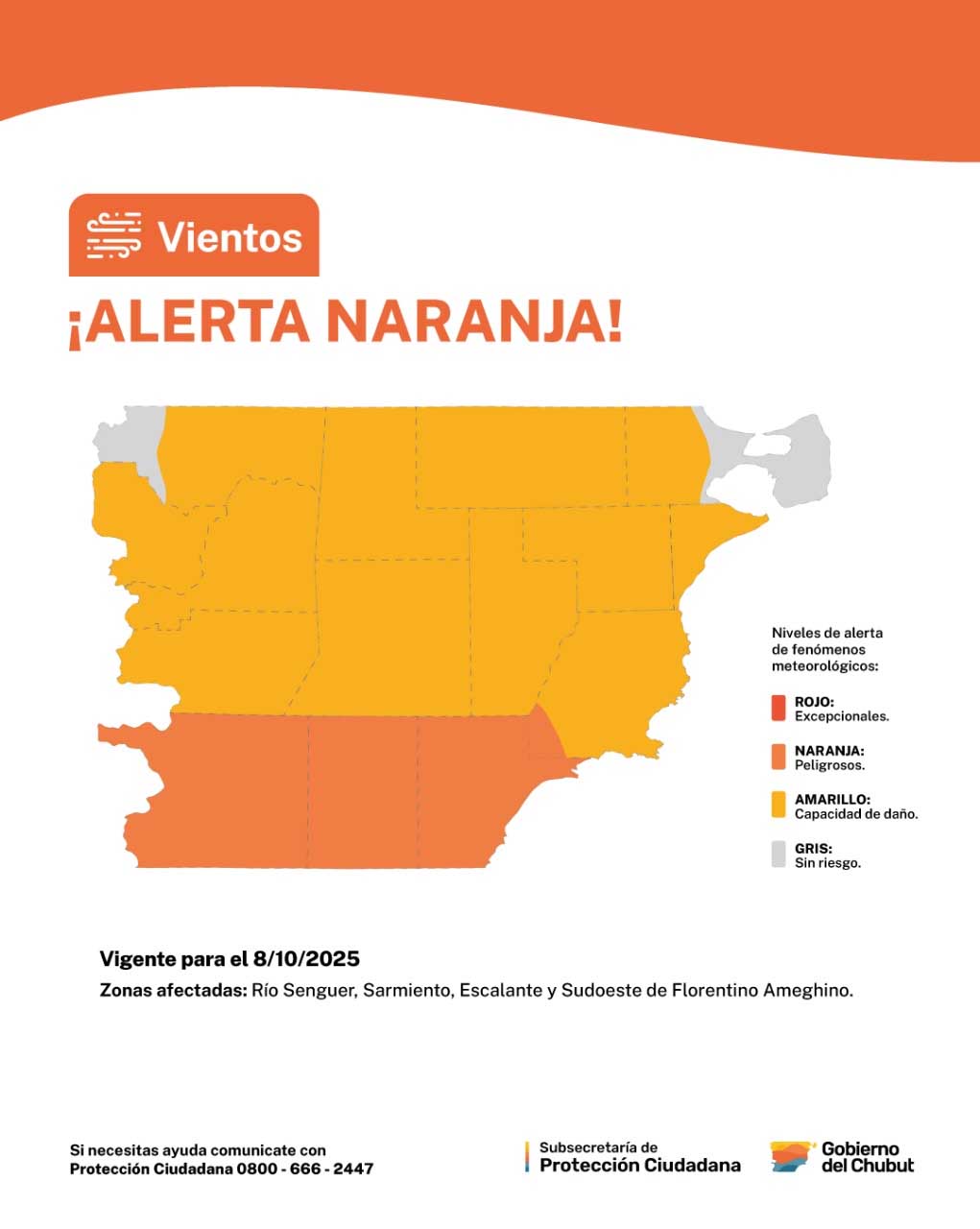 La Subsecretaría de Protección Ciudadana, dependiente del Ministerio de Seguridad y Justicia, informa sobre la zona de cobertura del alerta naranja por vientos, emitido por el Servicio Meteorológico Nacional prevista para la tarde del 8 de octubre.