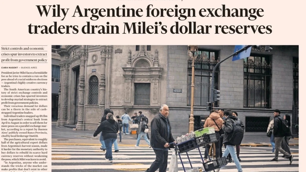«El fracaso de Milei en acumular reservas ha inquietado a los inversores en las últimas semanas e impulsado una liquidación de activos argentinos. La agitación del mercado comenzó el mes pasado cuando una mala derrota en las elecciones locales generó dudas sobre el apoyo a las reformas de Milei, lo que provocó la caída en picado de los precios de los bonos y del peso», señaló el artículo.